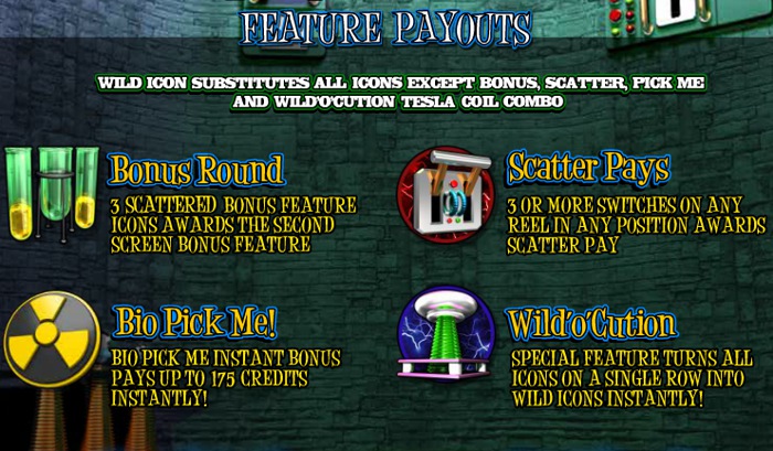 When the Tesla Coil symbol occurs on reels 1 and 5 on paylines 1, 2 or 3 the Wild’o’Cution will occur. The Tesla coils will activate, shocking themselves and the symbols between them to instantly turn them into wild icons, increasing your chances of winnings.