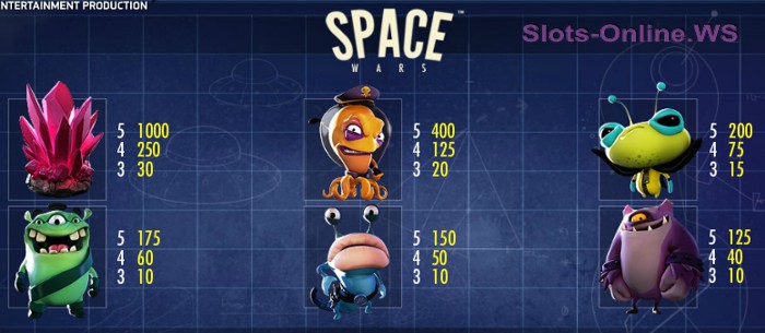 Space Wars slot machine is played with fixed 40 bet lines and bets from 1 to 10 coins per line. The regular winning symbols on the reels consist of 8 different Alien Creatures. 5 Red Crystals bring you the highest base line win of 1,000x your line bet, while the top possible win can reach incredible 400,000 coins a spin!